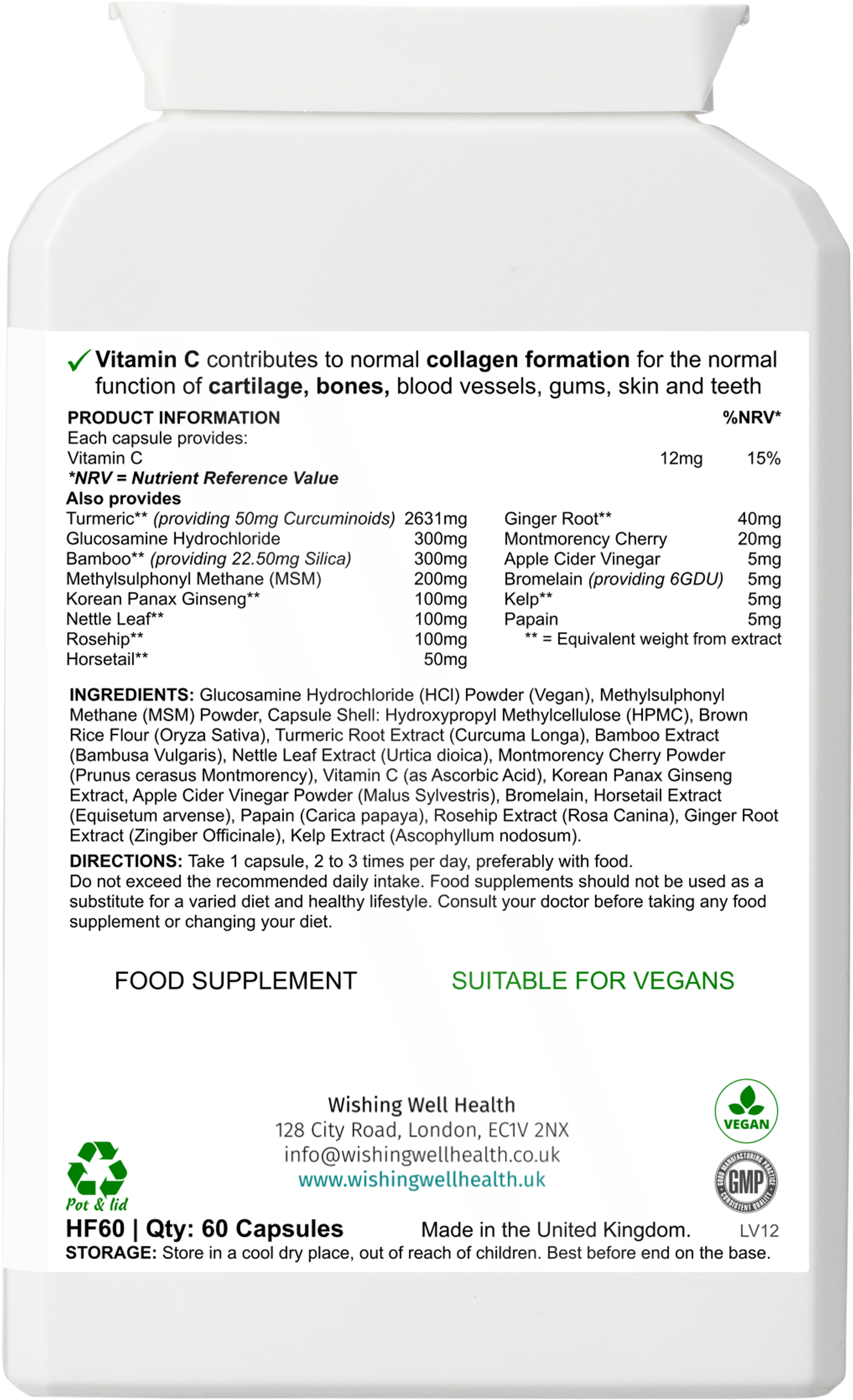 This vegan food supplement has been formulated to provide a tailored combination of glucosamine HCl, Methylsulphonyl Methane (MSM), vitamin C and other herbal and food-based ingredients, including: turmeric extract (with curcuminoids), nettle leaf, Montmorency cherry, Korean panax ginseng, apple cider vinegar powder, bromelain, horsetail herb, kelp, papain, rosehip and ginger root – all in one easy-to-take formula.